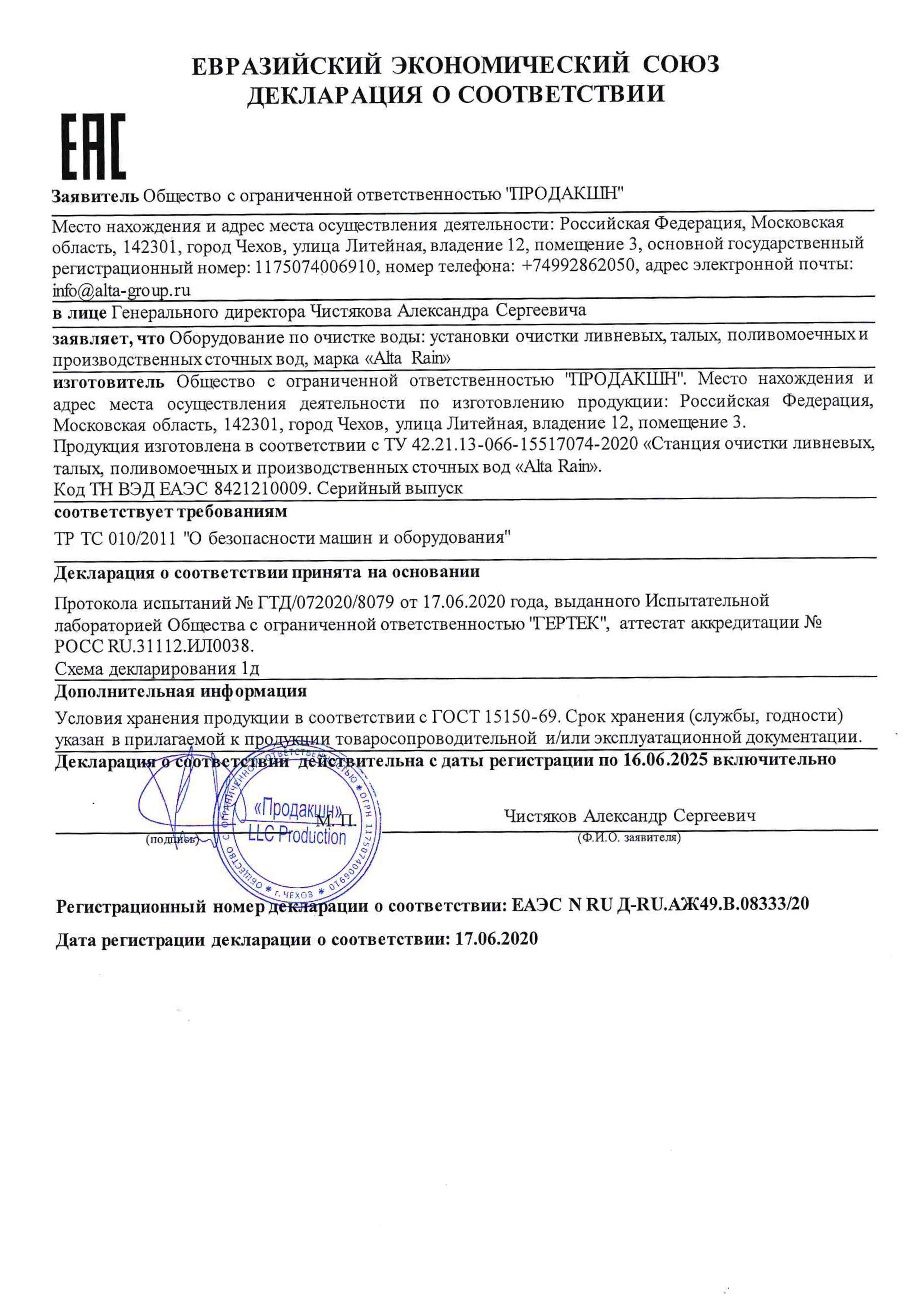 Комплекс поставляется в полной заводской готовности. Габариты блоков не превышают стандартные размеры, что позволяет транспортировать его типовым транспортом. Очистное сооружение ливневых стоков Alta Rain Pro 100 сертифицировано и снабжено всей необходимой документацией для монтажа, обслуживания и эксплуатации.