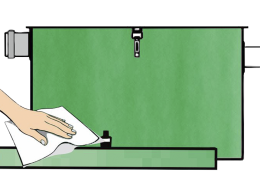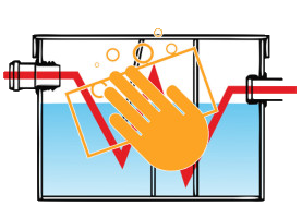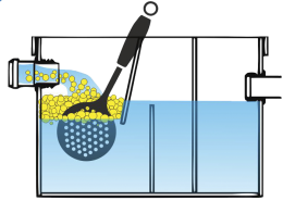 Открыть крышку жироуловителя. При помощи сачка с мелким ситом удалить жировые отложения с поверхности воды и стен жироуловителя.
