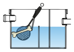 При помощи сачка с мелким ситом удалить при необходимости мусор и остатки пищи со дна жироуловителя.